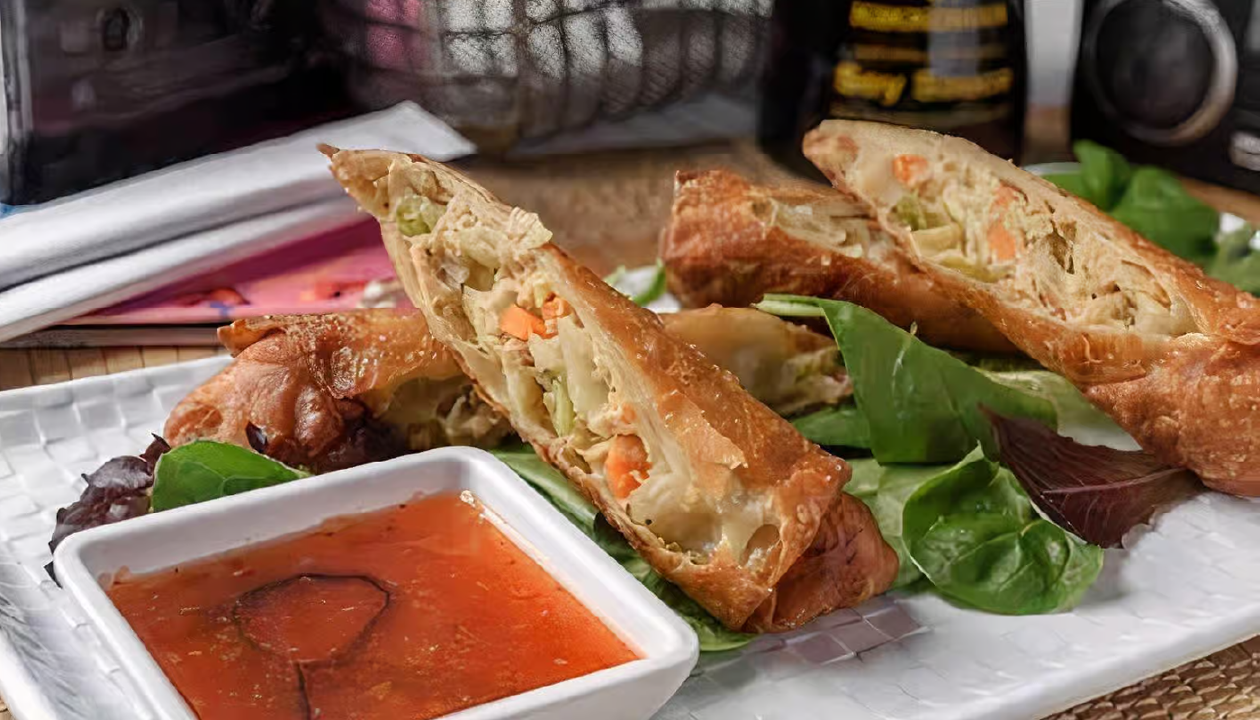 Two crispy fried pork and vegetable egg rolls with sweet chili sauce.