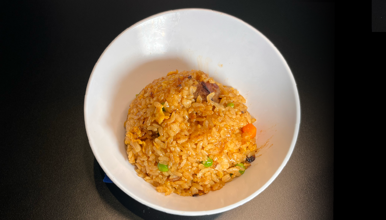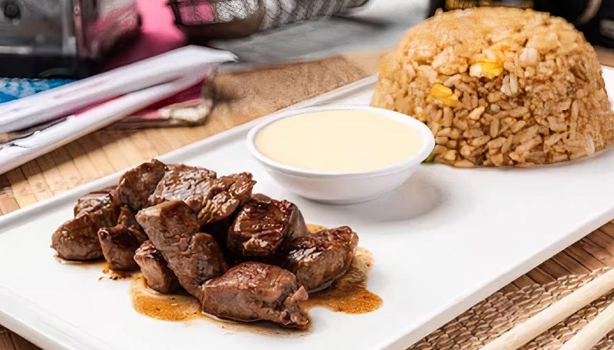 White Rice stir-fried with garlic butter, soy sauce, steak, egg, peas, carrots and teriyaki sauce.