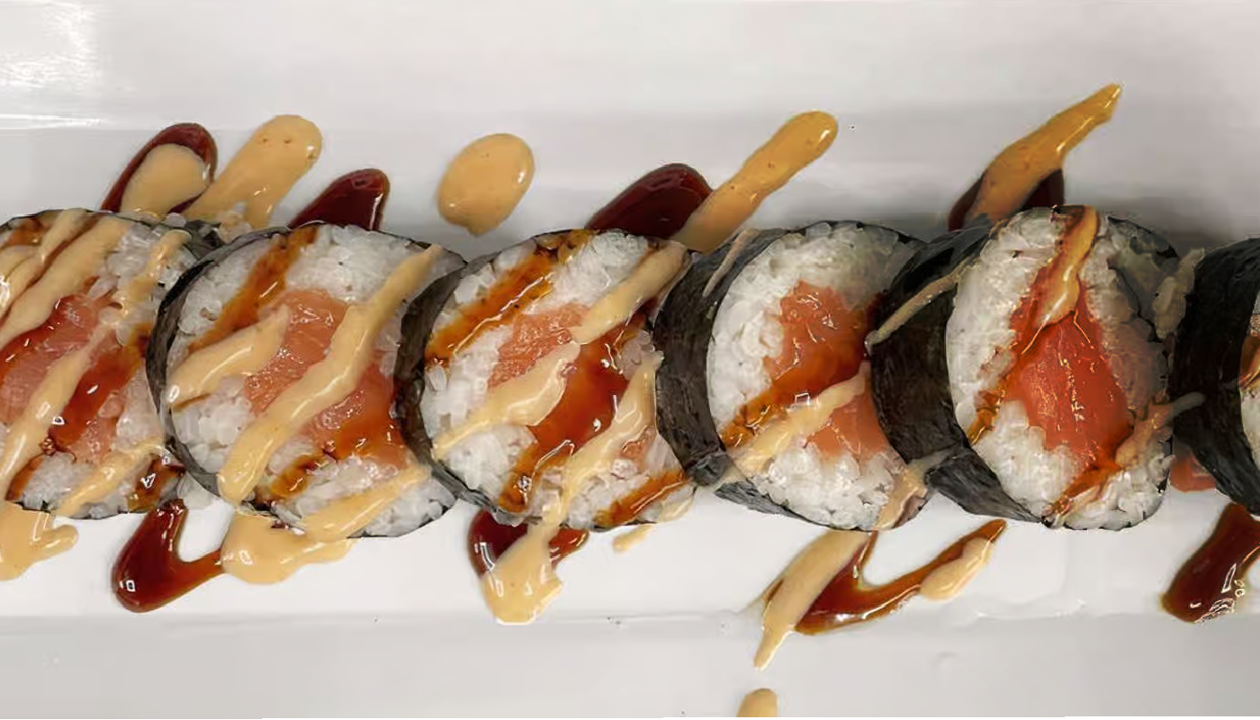(ORIGINAL OR FRIED) Fresh Salmon inside, topped with spicy mayo and eel sauce.