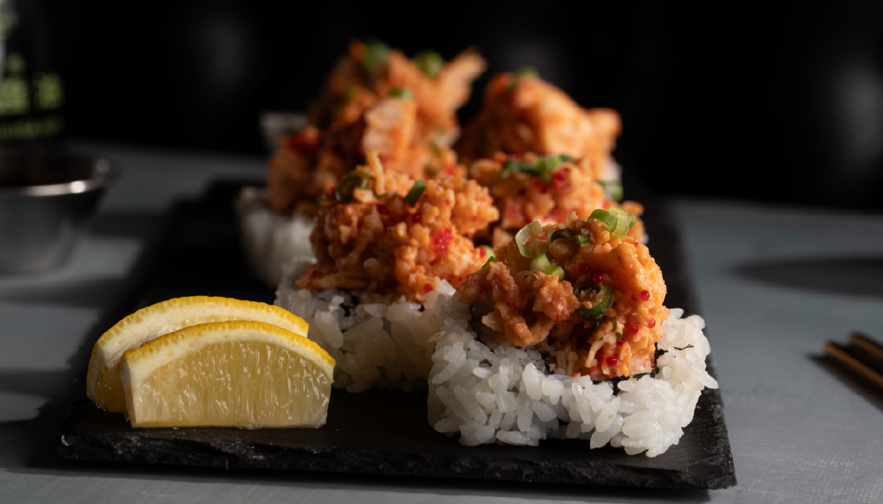 Tempura fried kanikama stick and shredded krab inside, topped with spicy lobster claw salad and fresh jalapeño. Served with a lemon wedge for an added bite.