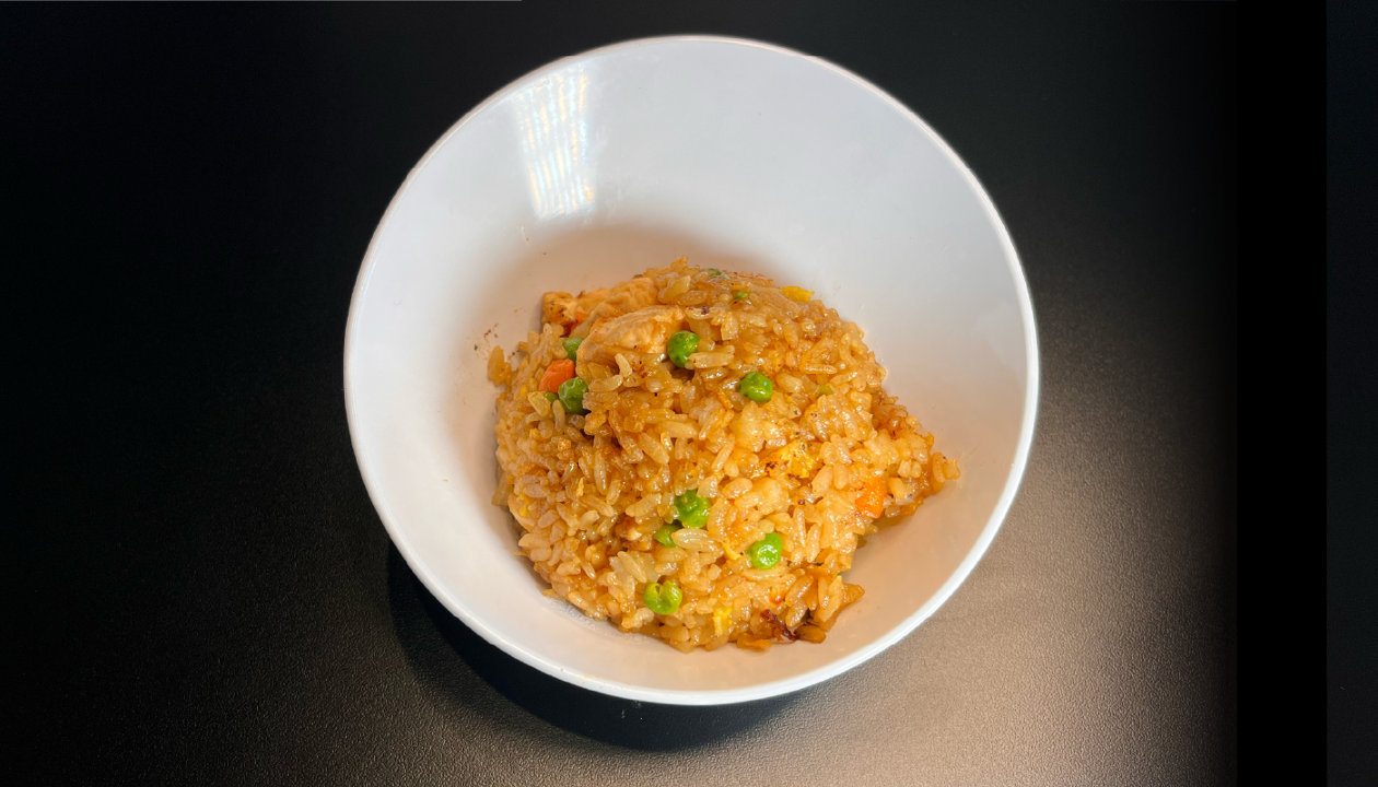 White Rice stir-fried with garlic butter, soy sauce, chicken, egg, peas, carrots and teriyaki sauce.