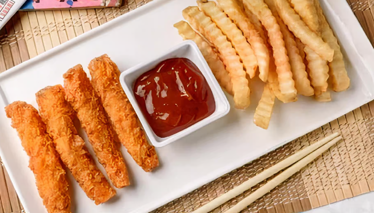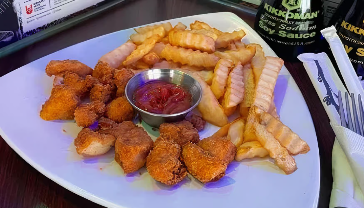 Hand breaded chicken nuggets and fries. Served with ketchup.