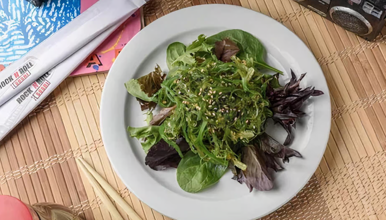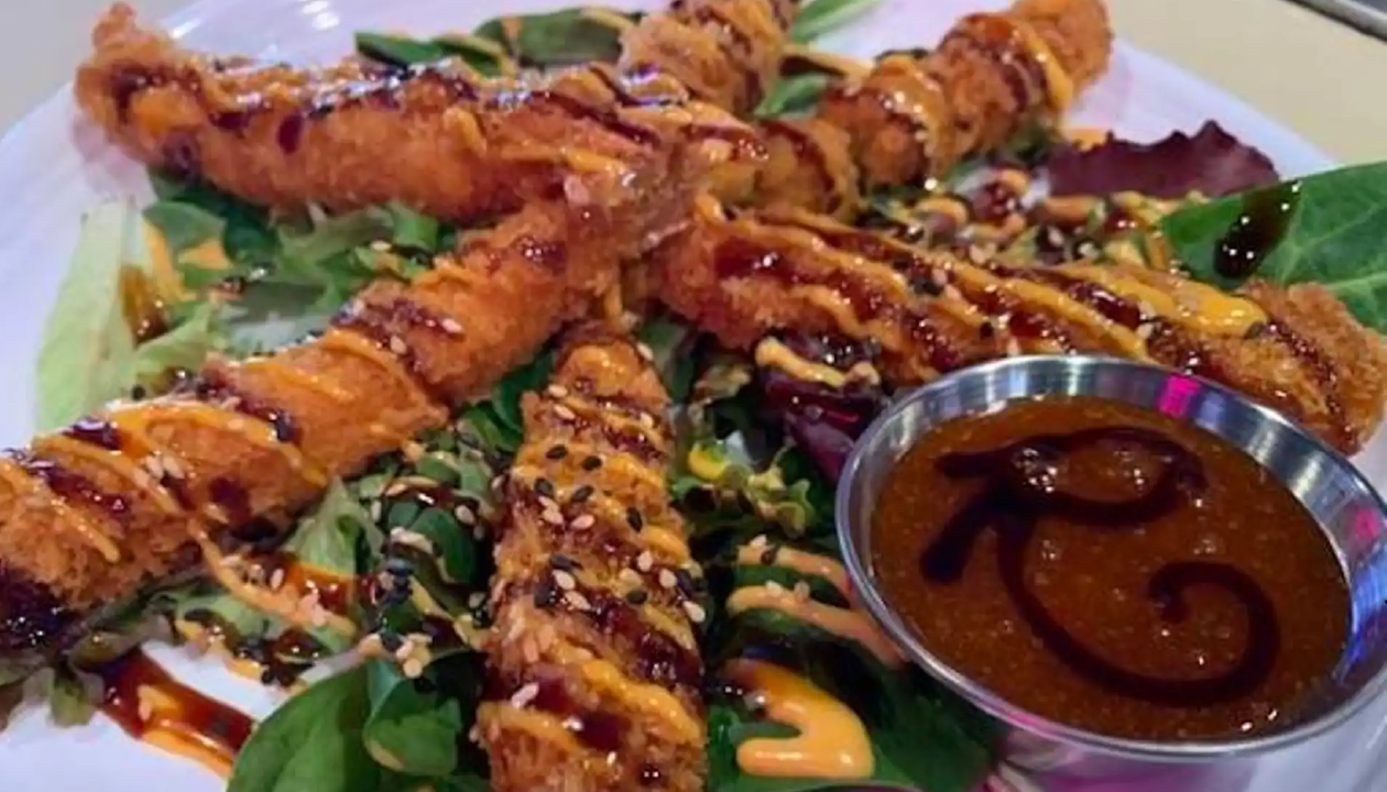 Your new favorite summer crush. 6 piece veggie roll topped with our signature punk rock topping. Fresh, sweet and spicy. This item is vegan and vegetarian. Roll contains avocado, spring mix, cucumber, strawberry, jalapeno, ponzu and sweet chili sauce.