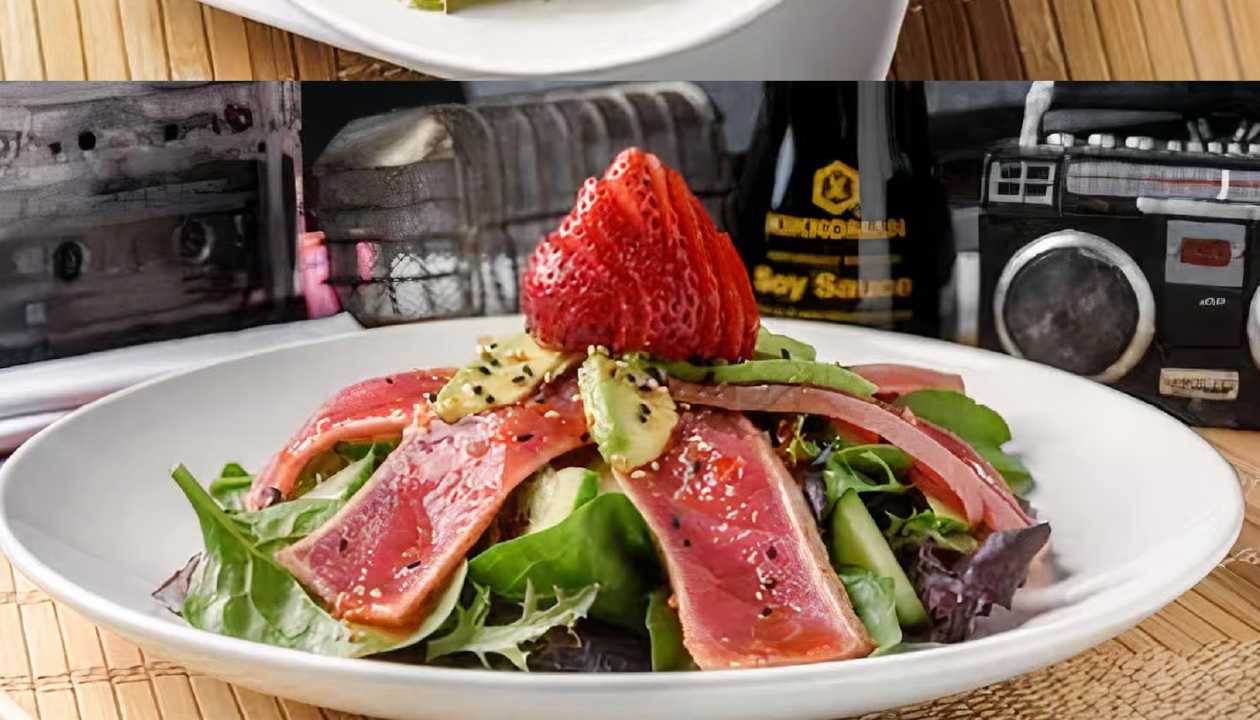 Seared tuna slices, cucumber, avocado and straberries piled on spring greens. Topped with sweet chili or ginger dressing, ponzu and sesame seeds.
