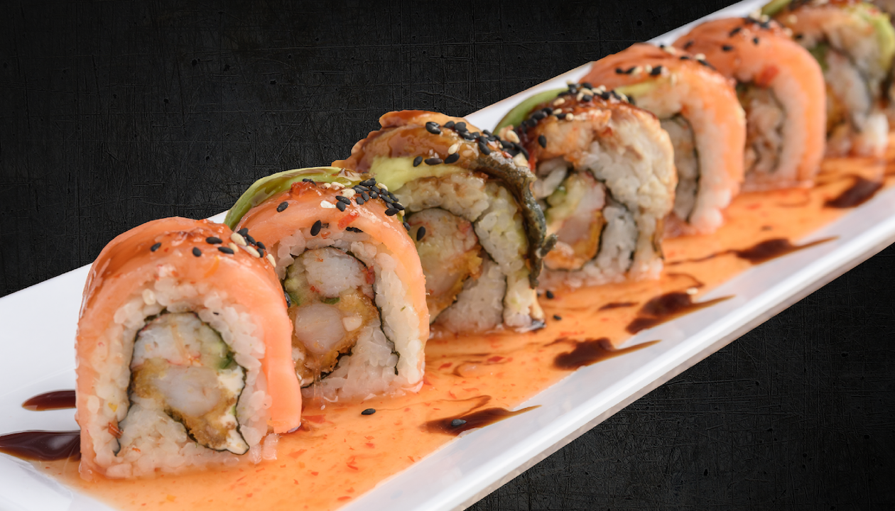 Shrimp tempura, krab stick, cream cheese and cucumber inside, smoked salmon, baked eel and avocado outside, topped with sweet chili, eel sauce and sesame seeds.