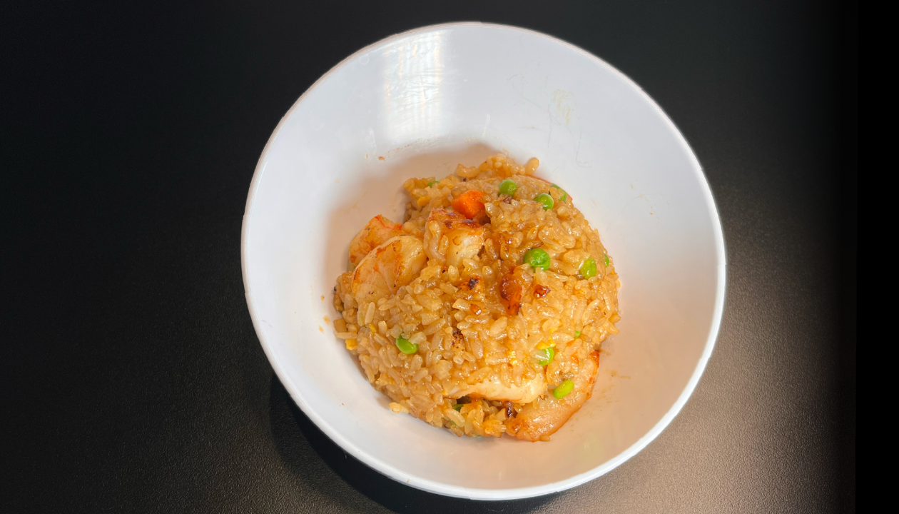 White Rice stir-fried with garlic butter, soy sauce, shrimp, egg, peas, carrots and teriyaki sauce.