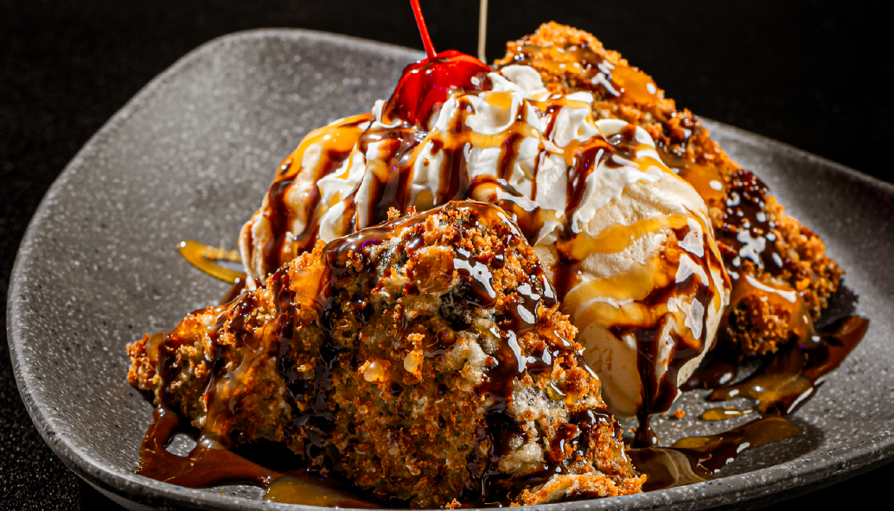 A towering stack of golden-fried brownieslices, vanilla ice cream, whipped cream,chocolate and caramel swirls—with a cherry on top. Epic.