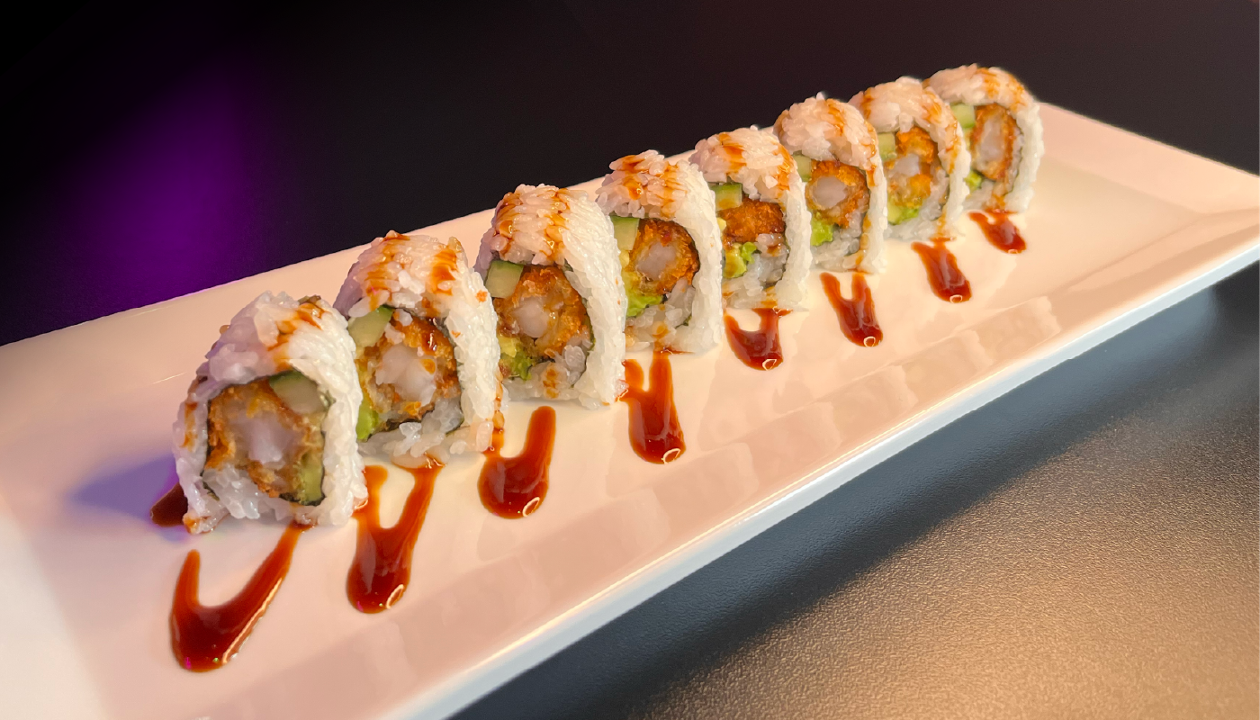 Sprimp Tempura, cucumber, avocado inside, topped with eel sauce.