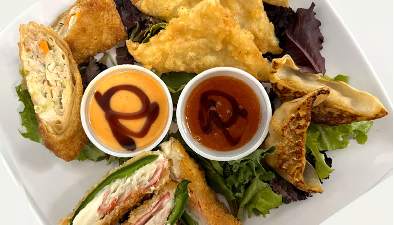 Crispy wontons, jalapeno poppers, eggroll and potstickes served with headbanger and sweet chili dip, both swirled with eel sauce.