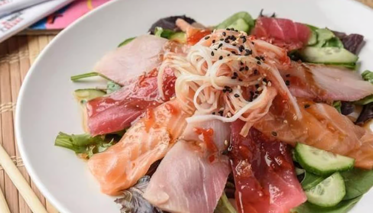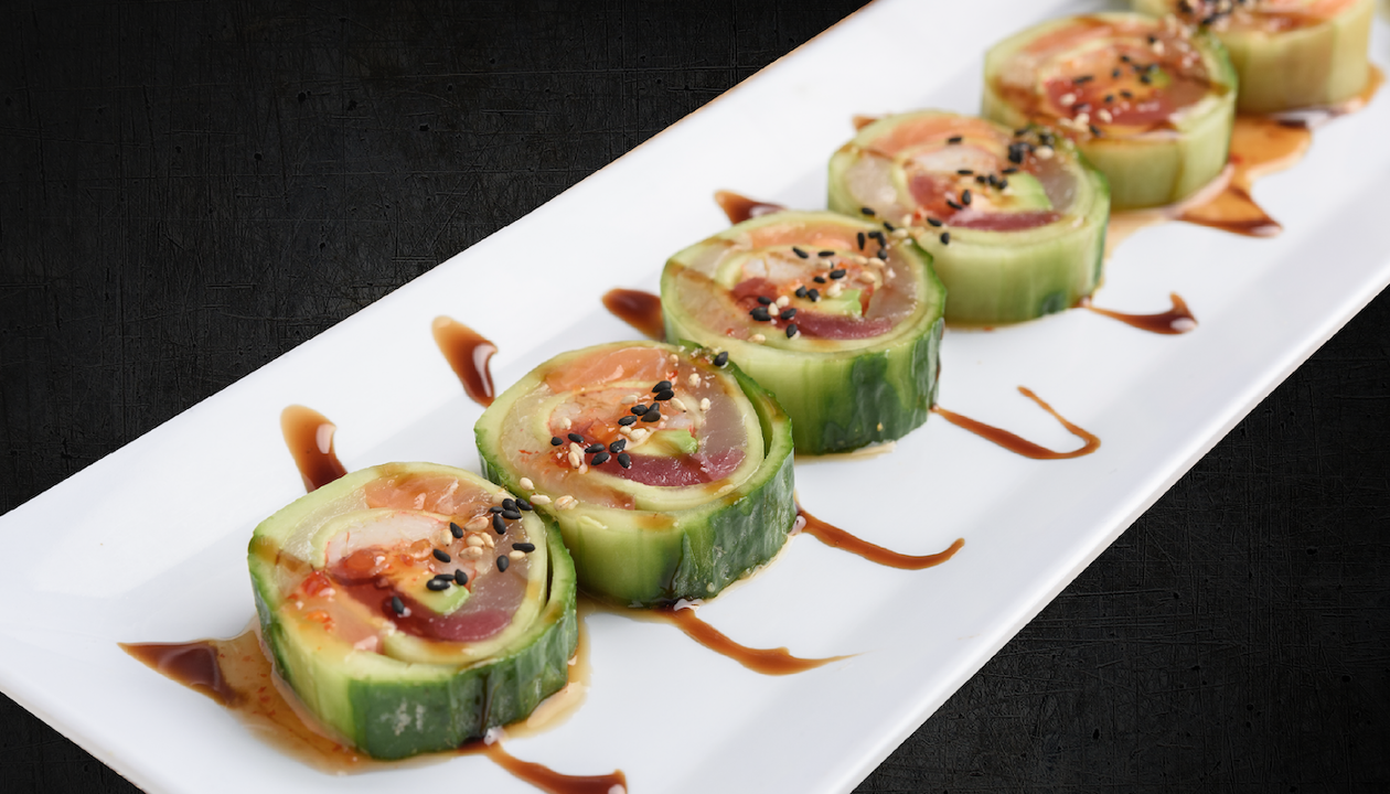 (CUCUMBER WRAP) Red tuna, yellowtail, salmon collaborated with krab stick and avocado wrapped in cucumber peel with sweet chili, ponzu, eel sauce and sesame seeds. Rice-free.