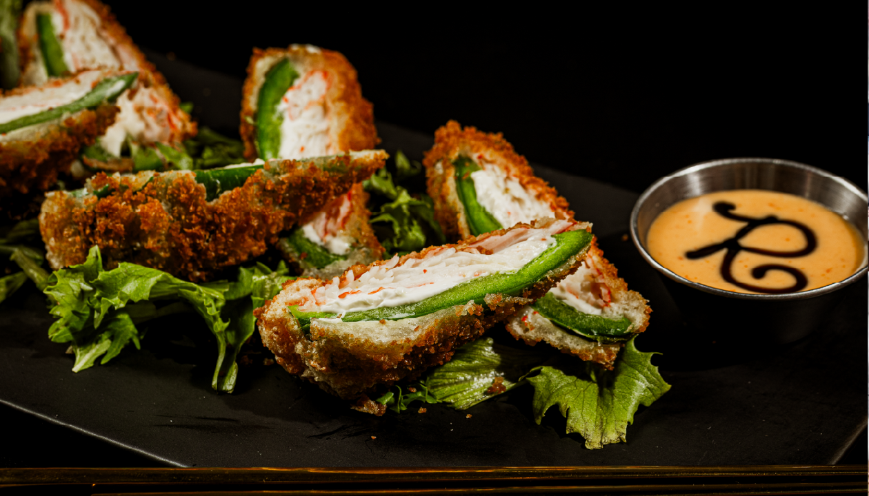 Fresh jalapeños stuffed with krab stick and cream cheese. Served with headbanger sauce swirled with eel sauce.