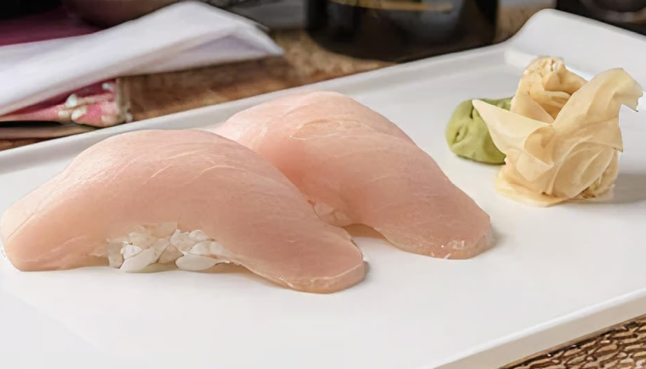 California roll inside, red tuna, fresh salmon, yellowtail and avocado outside, topped with sesame seeds.
