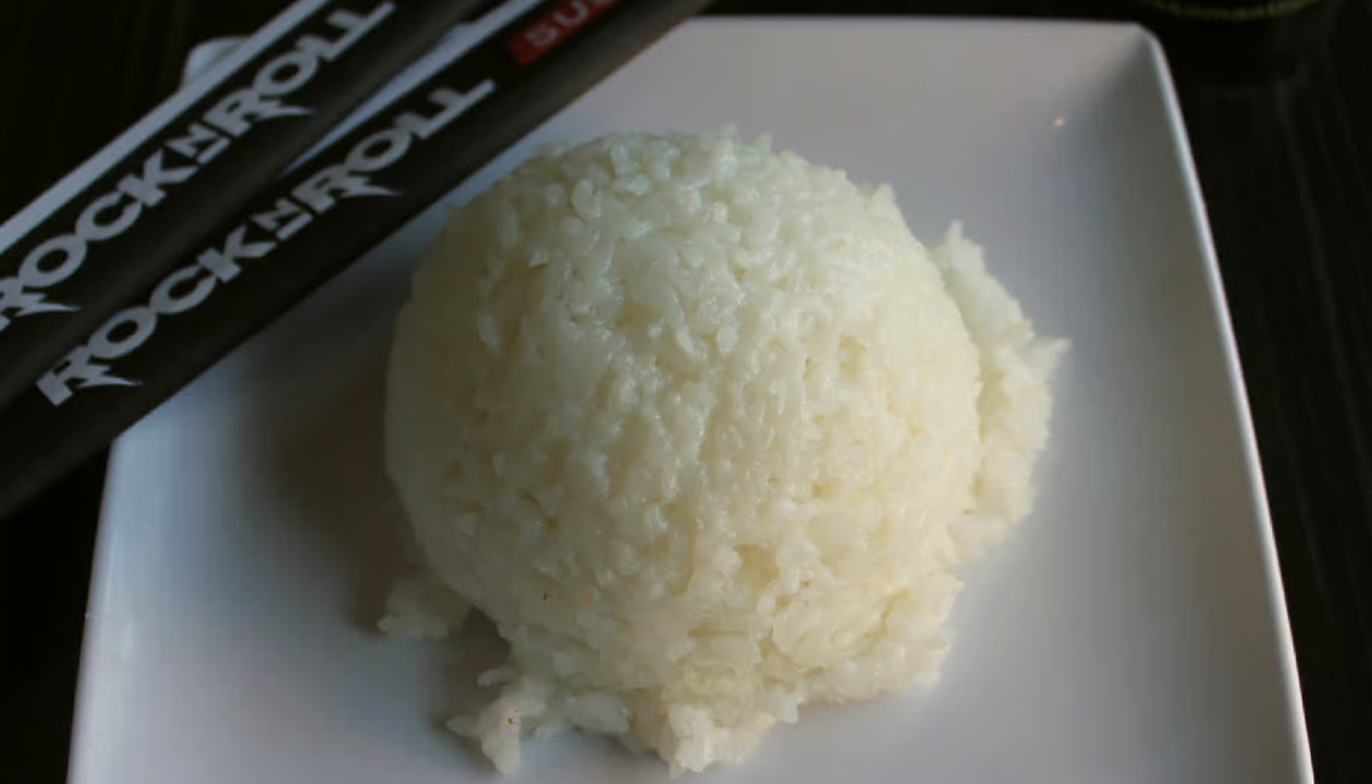 White Rice stir-fried with garlic butter, soy sauce, egg, peas, carrots and teriyaki sauce.